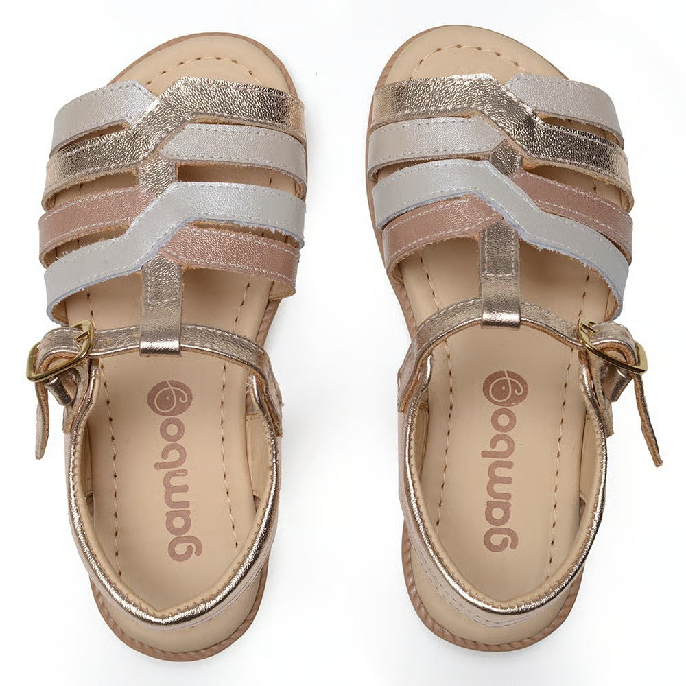 Sandália desenvolvida para a coleção de inverno, com design delicado e acabamento sofisticado. O modelo apresenta tonalidade dourada com brilho sutil e tiras delicadas, proporcionando um visual elegante e moderno, além de garantir excelente destaque no ponto de venda e alto potencial de giro. Confortável e versátil, é ideal para o uso diário e também para ocasiões especiais, oferecendo praticidade, segurança e bem-estar para a rotina da criança. CARACTERÍSTICAS Material interno e externo: 100% couro verdadeiro. Produzido com couro de alta qualidade, garantindo resistência, durabilidade e ajuste confortável, além de permitir a respirabilidade natural dos pés. Palmilha: Forrada em couro, proporcionando maciez e conforto durante o uso prolongado. Solado: TR emborrachado, com excelente flexibilidade, aderência e durabilidade. Conforto: Palmilha macia aliada ao solado flexível, oferecendo suporte adequado para o uso diário. Fácil de calçar: Sistema com fivela lateral, proporcionando ajuste prático e seguro. Costuras: Costuras reforçadas, assegurando maior resistência e maior vida útil ao produto. Fechamento: Fivela. Indicação de uso: Dia a dia e ocasiões especiais. Perfil de consumidor: Infantil feminino — ideal para crianças que buscam conforto, praticidade e um visual elegante no uso diário.